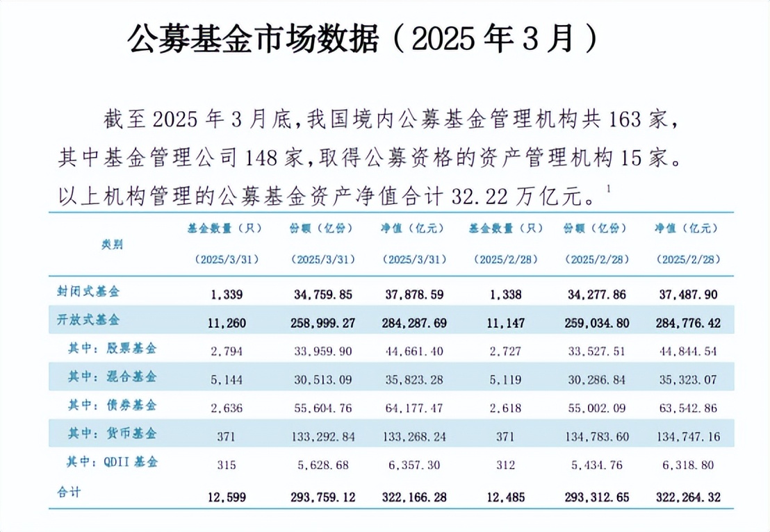 数据显示,截至3月底,境内共有163家公募基金管理机构,包括148家基金管理公司和15家取得公募资格的资产管理机构,合计管理资产净值32.22万亿元。3月公募基金份额增长至29.39万亿份,较2月增长0.15%,整体变化趋于平稳。